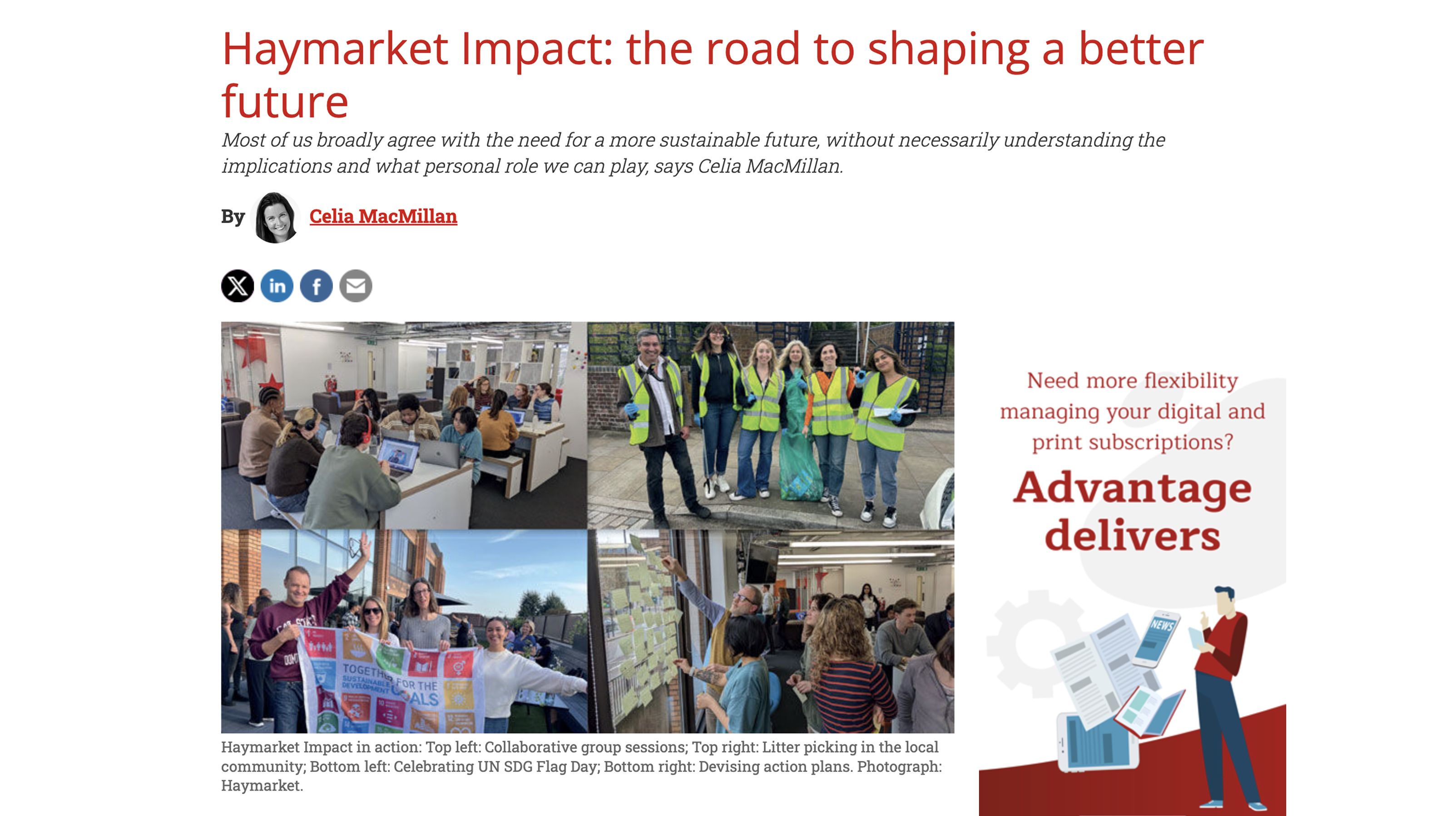 Chloe Harman, Editor of MIMS and spokesperson for Haymarket's UK Environment Network said: “Winning the Impact Innovator award and being globally recognised feels amazing! It means a huge amount to all of us in the UK Environment Network because it makes us feel like our efforts are not only making a difference, but are seen and valued by the company. This is a particularly special award category because it means that Haymarket genuinely believes in making the world a better place."